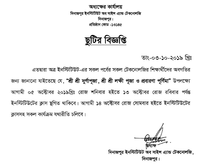 দিনাজপুর সাইন্স এন্ড টেকনোলজি'র সকল শিক্ষক-শিক্ষিকা এবং ছাত্র-ছাত্রীর অবগতির জন্য জানানো যাইতেছে যে,